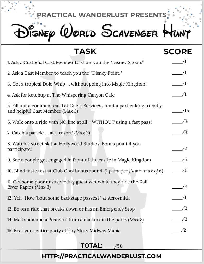 Get ready to take your Disney World trip to the next level with this massive 75 challenge, 250 point Scavenger Hunt!